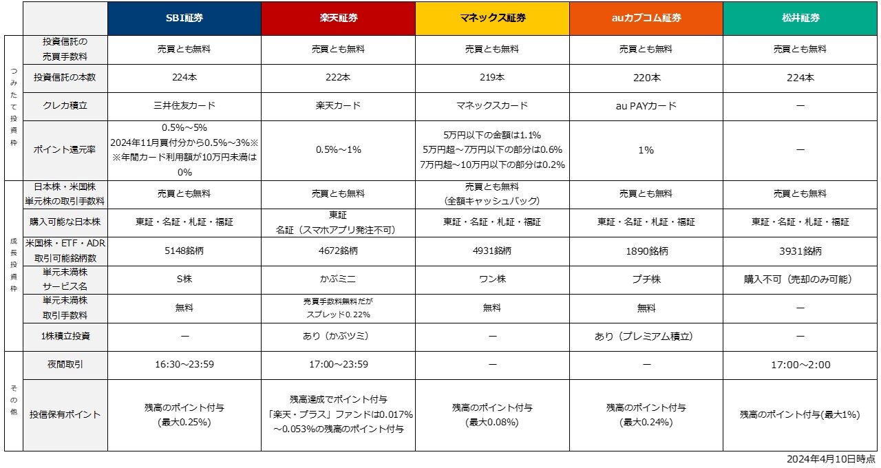 表は大手ネット証券のSBI証券・楽天証券・マネックス証券・auカブコム証券・松井証券の主なサービスを比較したものです。新NISAのつみたて投資枠の売買手数料や成長投資枠での日本株・米国株の売買手数料は、各社ともに無料。そのうえ、つみたて投資枠の商品数も豊富です。米国株などの銘柄数は、SBI証券・楽天証券・マネックス証券の3社が特に多くなっていますが、auカブコム証券・松井証券も充実しています。