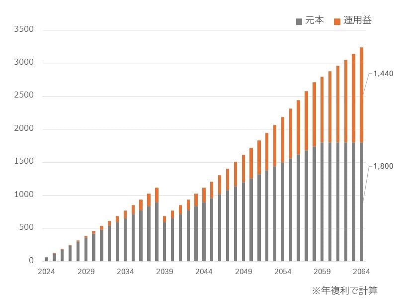 結果、40年後の2064年には元本1,800万円、運用益1,440万円、合計で3,240万円の資産が築けました。
