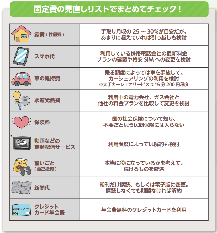 先取り貯蓄した上でのやりくりが厳しければ、これを機に固定費削減にも取り組んでみましょう。