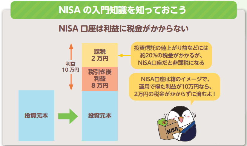 しかし、NISA口座で株式や投資信託を買うと、利益に税金がかからず10万円がまるまる受け取れるのです。
