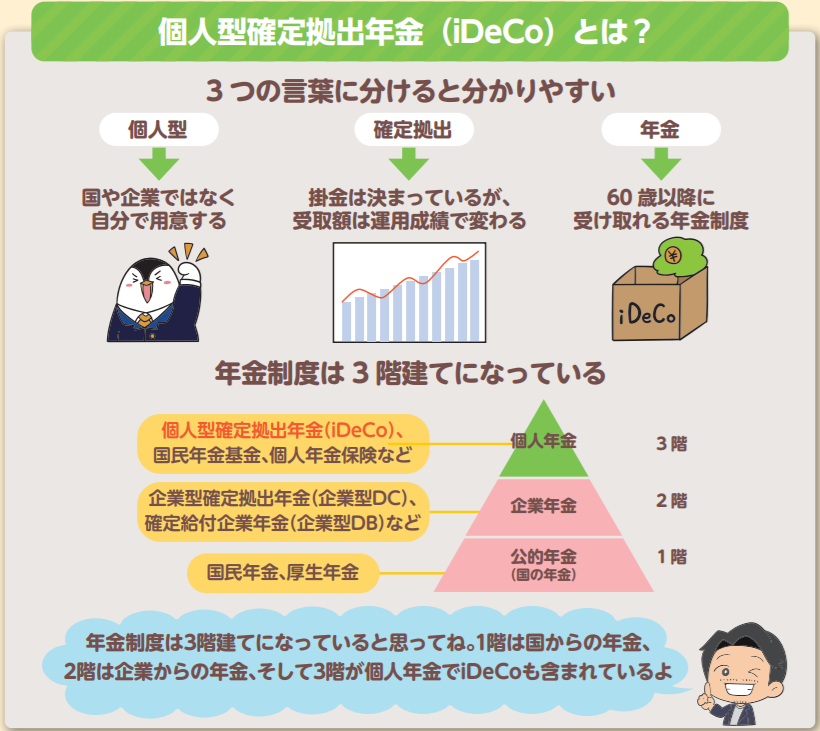 ちなみに、年金制度は大きく分けると3階建てになっており、1階は国民年金や厚生年金といった国が用意する公的年金です。2階は会社が用意する企業年金で、企業型確定拠出年金(企業型DC)や確定給付企業年金(企業型DB)などがあります。そして3階が自分で用意する個人年金で、個人型確定拠出年金であるiDeCoもここに含まれます。