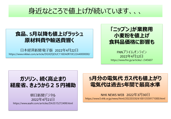 横田さん:インフレとは、簡単に言えば「モノの値段が上がること」です。身近なところでは、ガソリンや電気、ガス、小麦粉などの値段が実際に上がっています。