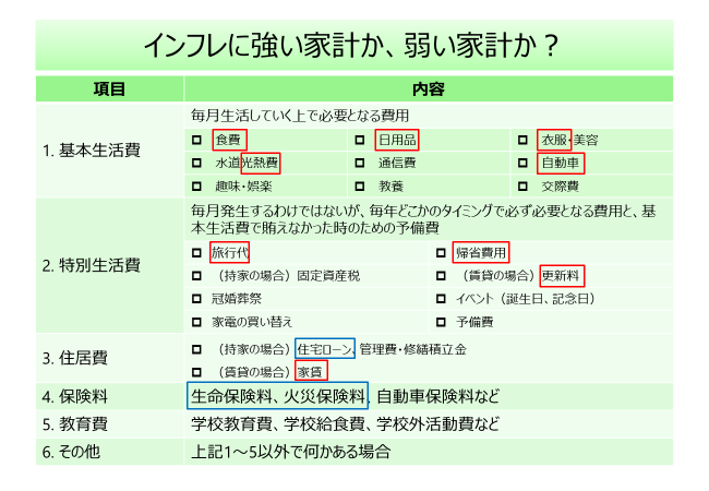 横田さん:インフレによる影響は各家庭の支出によって異なるので、まずは家計の支出状況を把握することが大切です。インフレに強い家計と弱い家計について以下の表で見ていきましょう。インフレの影響を受けやすいものは赤で、受けにくいものは青で囲んでいます。