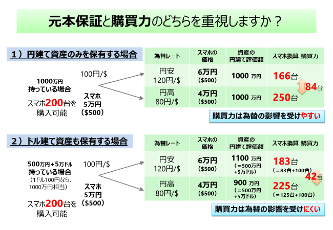 円だけで持っている場合は為替レートの影響を受けやすく、購買力のブレが激しいことが分かりますよね。一方、半分をドルで持っている場合は為替レートの影響を受けにくく、購買力が維持しやすくなります。