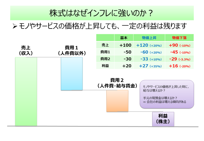 株式は、インフレによってモノやサービスの値段が上がり、企業側の支出が増えたとしても、売上も伸びることによって一定の利益が残りやすい傾向にあります。インフレ局面では株主の利益も増えていく可能性があるので、株式はインフレに強い資産といわれています。