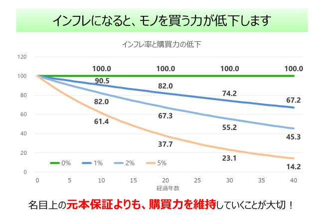 例えば、老後2,000万円問題と一時騒がれましたよね?平均値で計算した場合、現時点のモノの値段や必要な資金を計算したときには2,000万円あれば足りるという話でしたが、このまま年2%のインフレ率が続くと、モノの値段が上がる一方で購買力が下がっていくので、40年後には老後4,000万円問題になっている可能性もあるということです。