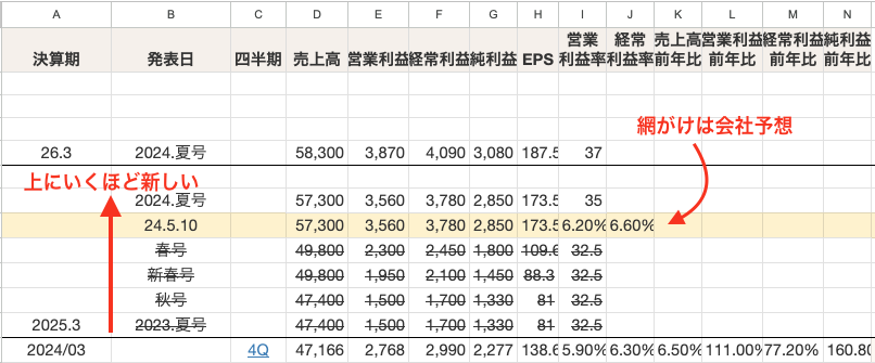 毎号記載していれば、業績の拡大に勢いがついたり、逆に鈍化したりといった些細な変化に気づくことができます。これには少し手間がかかりますが、人より先んじてチャンスを見つけたり、もしくはリスクに気付いたりできますので、毎回のルーティンとして継続しています。