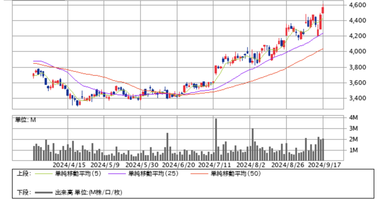 例えば下記の神戸物産(3038)のチャートをみると、6月下旬に25日移動平均線(紫色の線)を超えた後は株価がずっと上昇していますから、この間は保有を続けることで利益を伸ばすことができます。