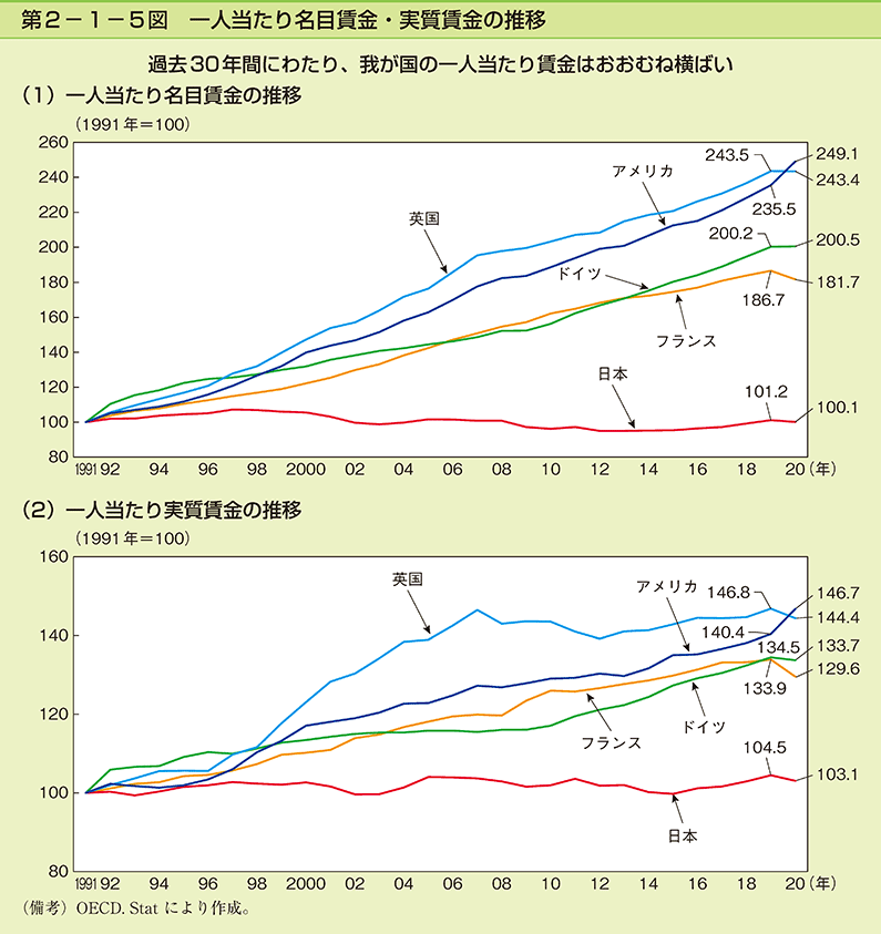 日本の賃金上昇率はここ30年の間、ほとんど上昇していませんし、足元では名目賃金は上昇しているものの物価上昇に追いついておらず、実質賃金は減少が続いています。景況感が悪い原因もここにあると言われています。