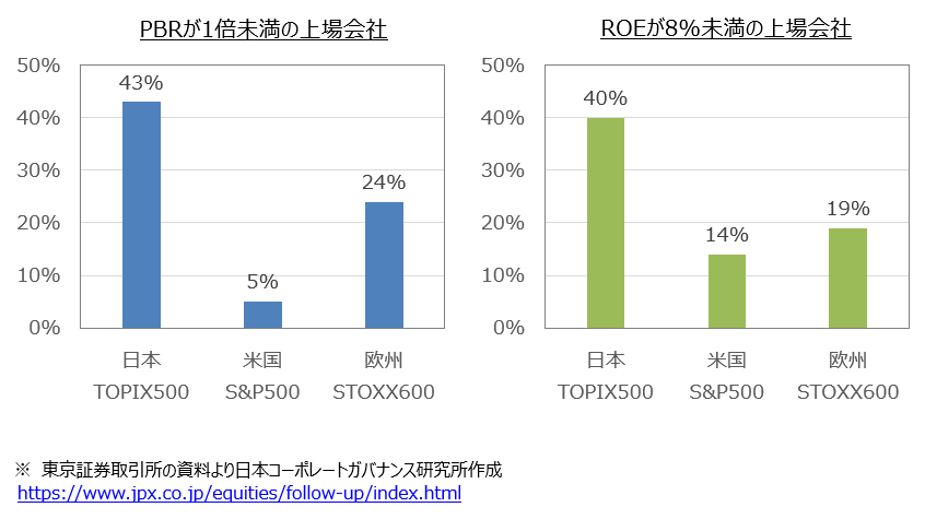 なお、株主にとっての投資収益率を意味する指標としては、ROE(Return On Equity:自己資本利益率)が広く知られています。このROEが資本コストを超えていれば、その会社は最低限の期待を上回る価値を創造しており、その評価が株価に反映されればPBRは1倍を超えるはずです。東証は、「多くの日本企業がROE8%未満に止まっていることが、低PBRにつながっている」と指摘しています。すなわち、資本コストを上回るROEを達成し、PBR1倍以上を目指すことが、広く日本の上場会社に求められているのです。