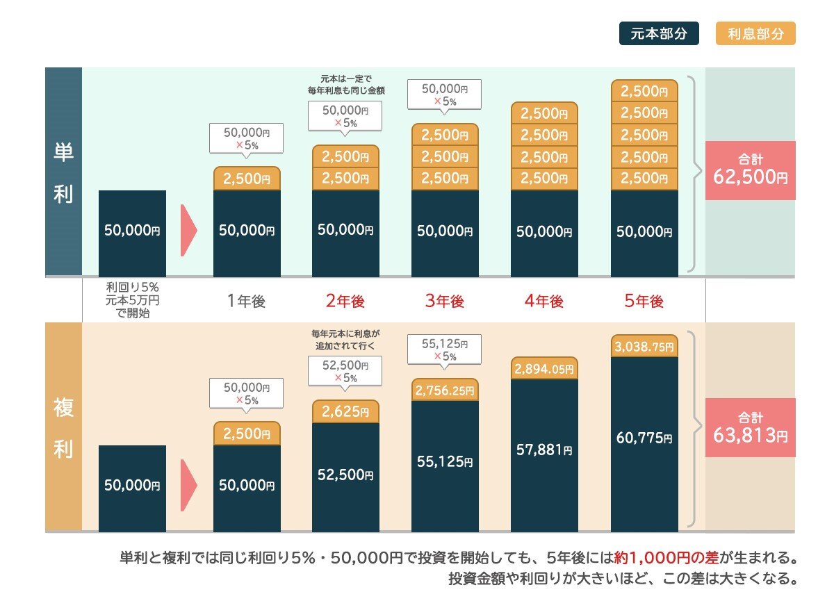 上記は「複利」と「(収益を再投資に回さない)単利」のパフォーマンスをグラフにしたもの。投資期間が長くなるほど、複利と単利の差が大きくなることがわかる