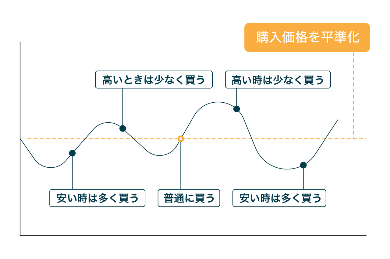 暴落時でも普段と同じ金額で買い増す「ドルコスト平均法」は有効です(図1)。暴落時には安値で多くの口数を購入でき、長期的には取得単価を下げる効果が期待できます。積立投資が本領発揮するのは暴落時とも言えるのです。