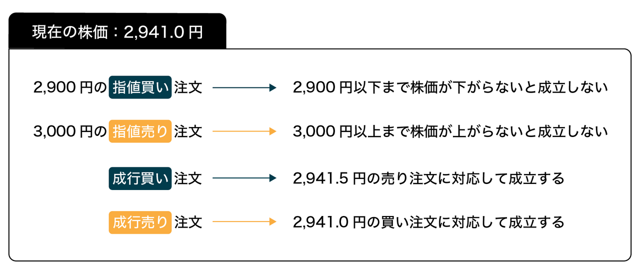 逆に、自身が指定した買値まで株価が下がらなければ買うことができませんし、指定した売値まで株価が上がらなければ売り注文は成立しません。